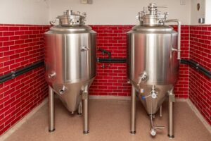 Wir setzen konische Gärtanks ein für eine bessere Temperaturkontrolle und einem professionellen Abschneiden der Hefen und Sedimenten von unserem reinen Bier.